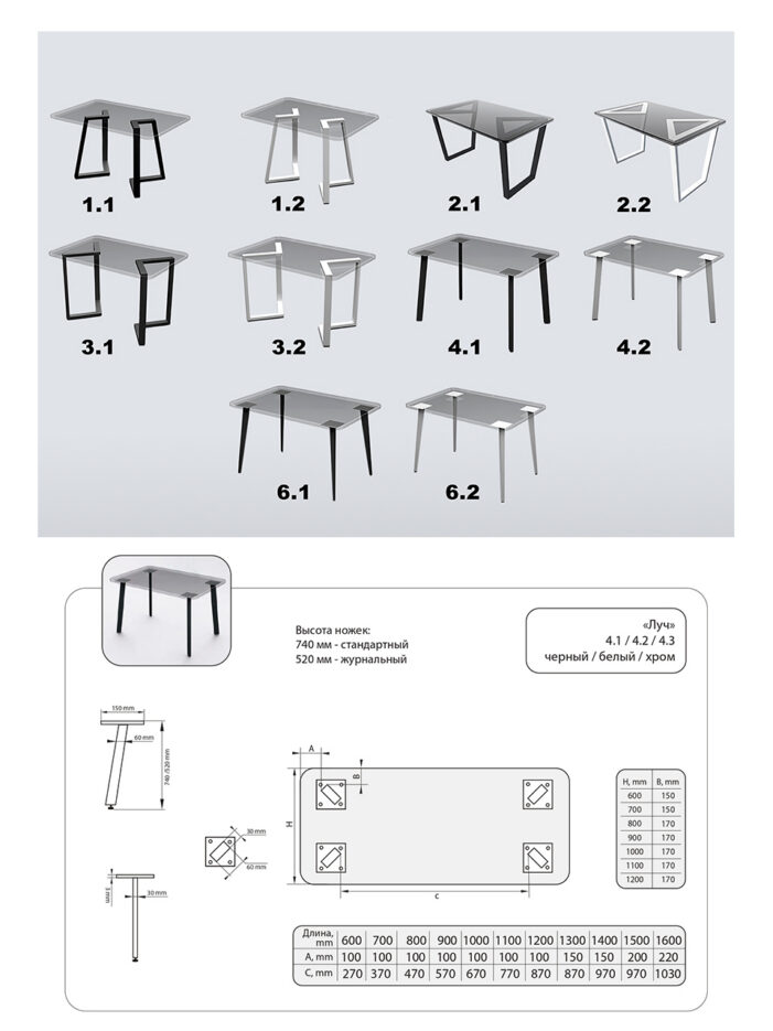 Ножки столов изготовлены из качественного стального профиля размером 60х30 мм, толщина металла 1,5 мм, заводская порошковая покраска, регуляторы высоты. Два цвета - белый и черный.