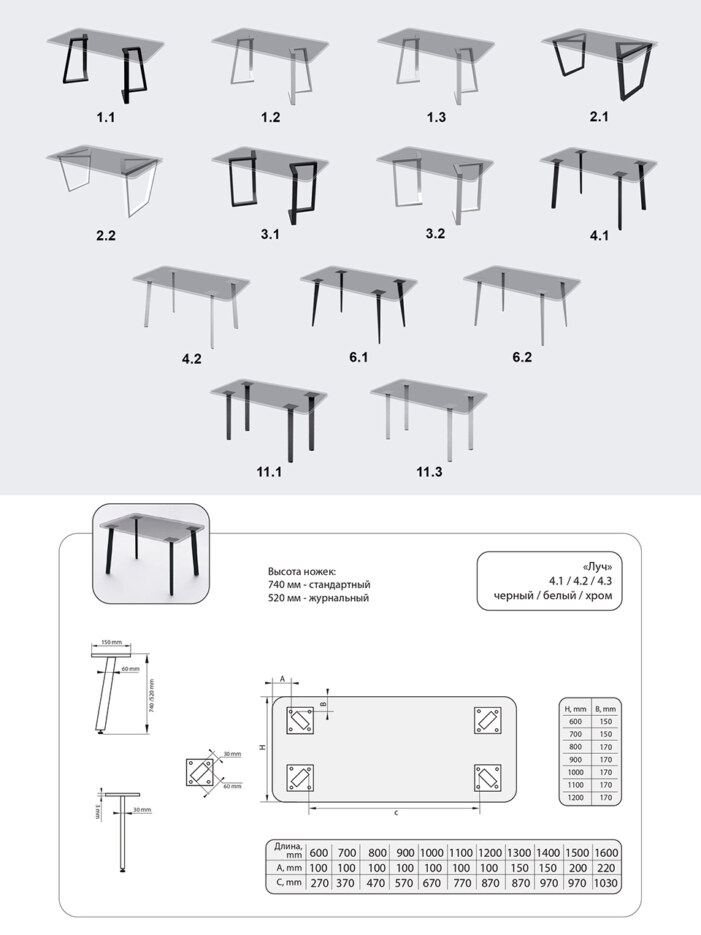 Ножки столов изготовлены из качественного стального профиля размером 60х30 мм, толщина металла 1,5 мм, заводская порошковая покраска, регуляторы высоты. Два цвета - белый и черный.