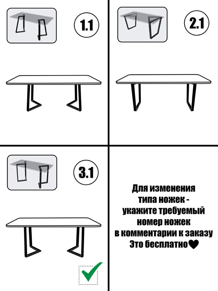 - Комплектация: деревянный ящик. Ножки упакованы в пупырчатую плёнку и картонную коробку. В комплекте (в упаковке с ножками) винты для крепления ножек к столешнице - 8 шт. (винт 6*40 мм) и ключ шестигранный - 1 шт.