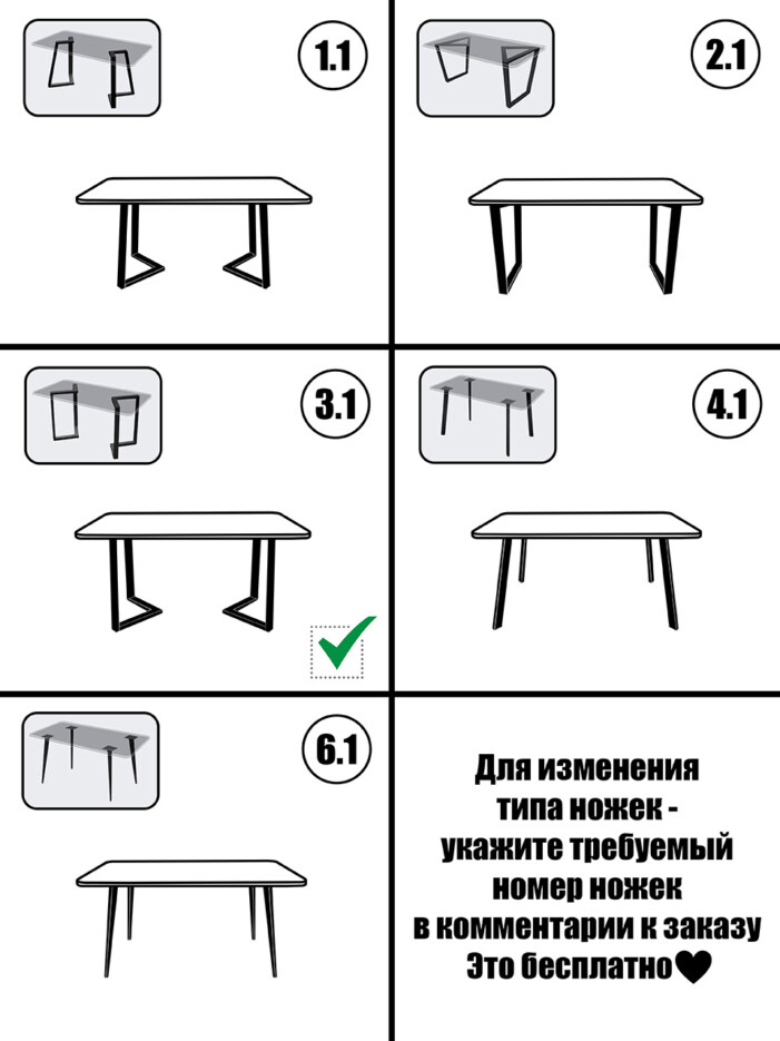 - Комплектация: деревянный ящик. Ножки упакованы в пупырчатую плёнку и картонную коробку. В комплекте (в упаковке с ножками) винты для крепления ножек к столешнице - 8 шт. (винт 6*40 мм) и ключ шестигранный - 1 шт.