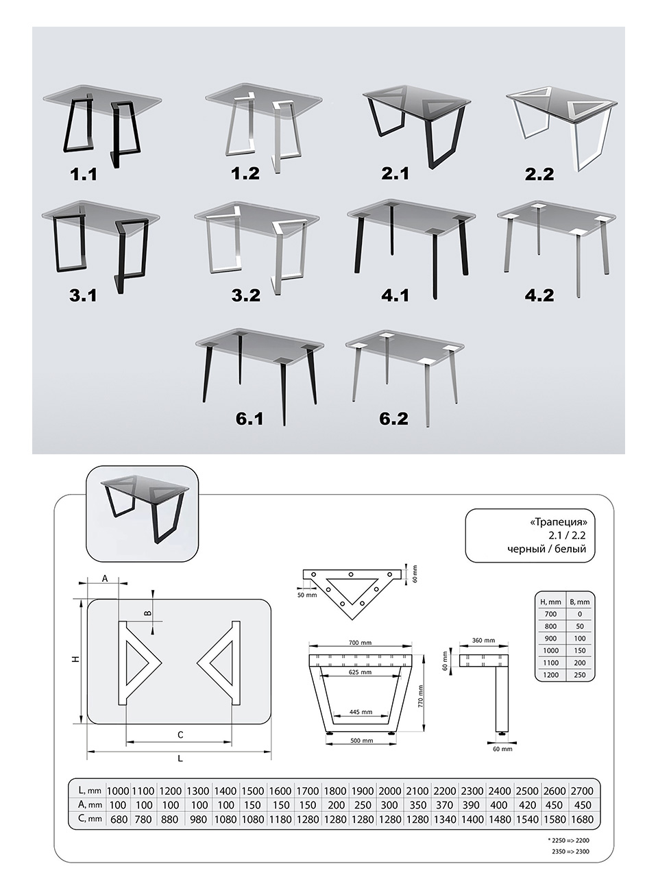 Ножки столов изготовлены из качественного стального профиля размером 60х30 мм, толщина металла 1,5 мм, заводская порошковая покраска, регуляторы высоты. Два цвета - белый и черный.