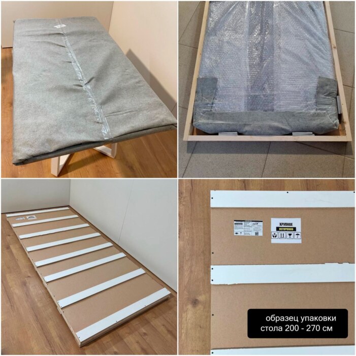 - Комплектация: деревянный ящик. Ножки упакованы в пупырчатую плёнку и картонную коробку. В комплекте (в упаковке с ножками) винты для крепления ножек к столешнице - 8 шт. (винт 6*40 мм) и ключ шестигранный - 1 шт.