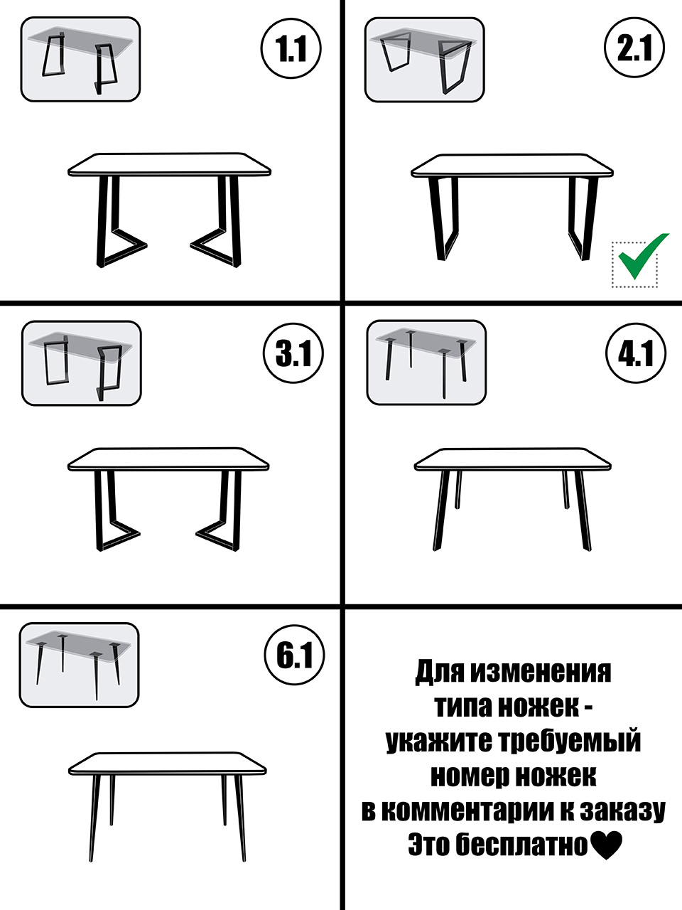 - Комплектация: деревянный ящик. Ножки упакованы в пупырчатую плёнку и картонную коробку. В комплекте (в упаковке с ножками) винты для крепления ножек к столешнице - 8 шт. (винт 6*40 мм) и ключ шестигранный - 1 шт.