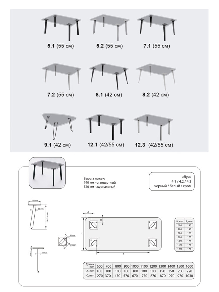 Ножки столов изготовлены из качественного стального профиля размером 60х30 мм, толщина металла 1,5 мм, заводская порошковая покраска, регуляторы высоты. Два цвета - белый и черный.